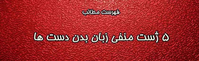 در این قسمت ژست های منفی زبان بدن دست ارائه می شود. سعی کنید از این ژست ها در زبان بدن خود استفاده نکنید و یا تا آنجا که امکان دارد از این ژست ها پرهیز کنید.