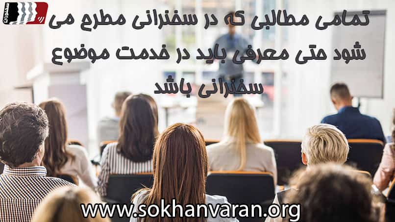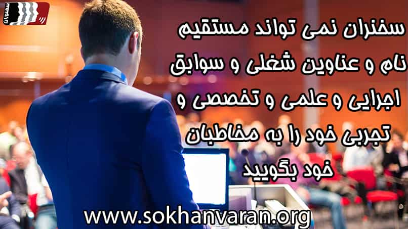 بنابراین شما به عنوان سخنران نمی توانید مستقیم نام و عناوین شغلی و سوابق اجرایی و علمی و تخصصی و تجربی خود را به مخاطبان خود بگویید. علت آن است که سخنوران در سخنرانی و سخنوری خود، هر مضمونی که می خواهند بیان کنند باید به آن موضوعیت ببخشند و در قالب موضوع به مضمون بپردازند و نمی توانند رک و مستقیم و بدون ارتباط با موضوع سخنرانی، کلام و سخنی را بر زبان بیاورند.